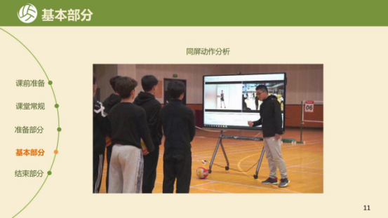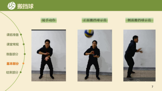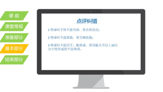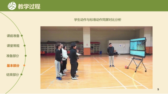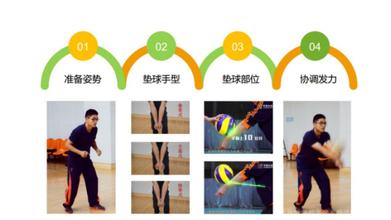 学生通过认真聆听学生小组和教师讲解、观察动作示范,模仿练习,体会各种垫球技术的基本要领,学生练习过程中进行互评互纠;教师巡回指导、纠错并利用手机拍摄练习视频,上传到多媒体大屏,组织学生通过专业运动分析软件对学生练习的技术动作和慕课中标准动作进行对比分析,鼓励学生沟通交流,学生自己对技术动作进行自评,找出优势和出现错误动作的原因和纠正的方法。利用信息化工具的及时性、直观性更好的服务于教学。