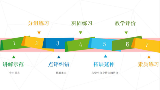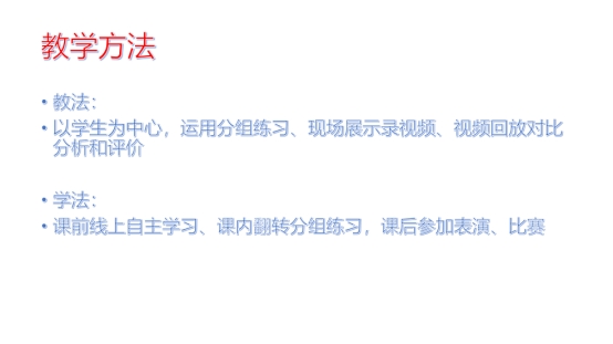 以学生为中心,运用分组练习、现场展示录视频、视频回放对比分析和评价 |