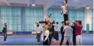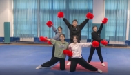 播放视频,让学生观看双底座肩位托举的示范动作。 播放双底座肩位托举的技术动作示范视频,讲解技术完成过程中的重点和难点,安全保护提示。 |