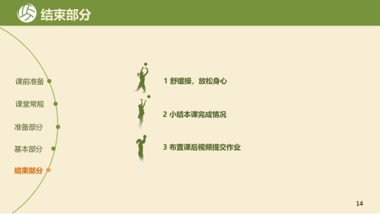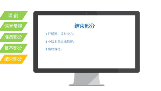 在结束放松环节,学生边进行拉伸放松练习,边观看大屏幕,教师将所拍的本节课部分练习内容进行回放,对本堂课教学内容——气排球特有垫球技术的要领进行总结与提炼,总结本课内容,举例点评学生技术动作学习掌握情况,评价本课;充分肯定同学们的课堂表现,鼓励大家在今后的学习与生活中积极参与排球活动,培养团队协作意识。课后布置学生,通过网络、书籍等工具为下一次课提供更好学习和交流平台。