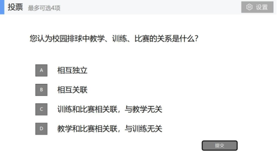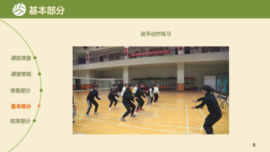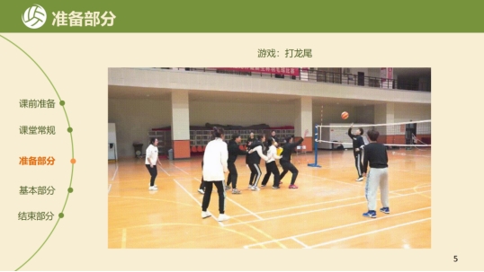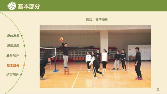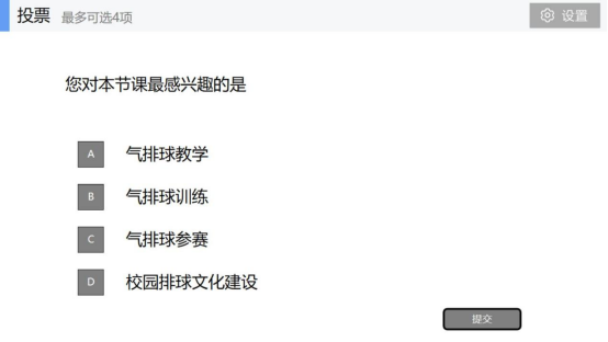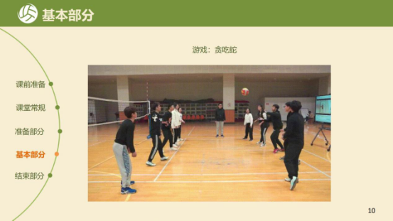 7.在课堂教学中,让学生了解气排球是一项适合不同年龄、不同性别、不同体质和训练程度的人的运动。通过游戏引入课堂,创设特定情境以激活学生的问题意识,形成基于问题的学习任务;使问题与学生原有认识结构中的经验发生联系,激活新知识。激发学生学习兴趣,帮助学生形成学习动机,提高学生的兴奋性和积极性,同时检验学生课前慕课自学质量,培养学生求知欲望。