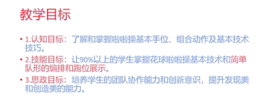 1.认知目标:了解和掌握啦啦操基本手位、组合动作及基本技术技巧。 2.技能目标:让90%以上的学生掌握花球啦啦操基本技术和简单队形的跑位展示。 3.思政目标:培养学生的团队协作能力和创新意识,提升发现美和创造美的能力。 |