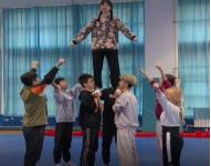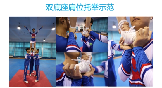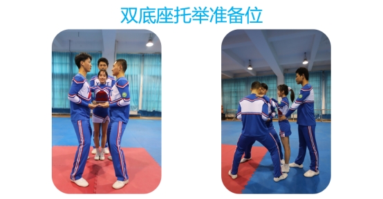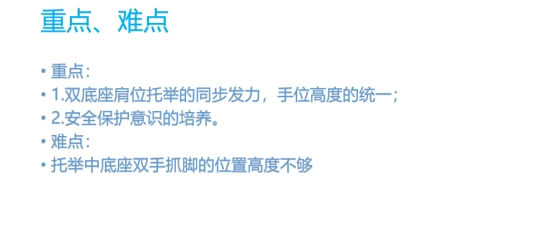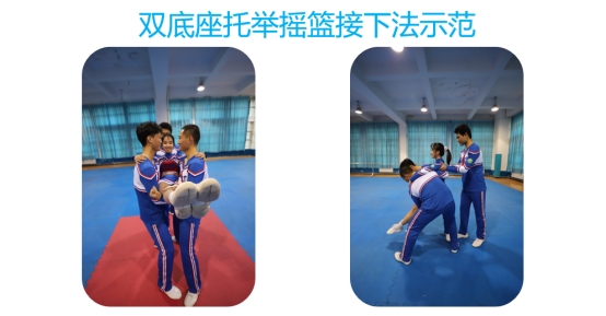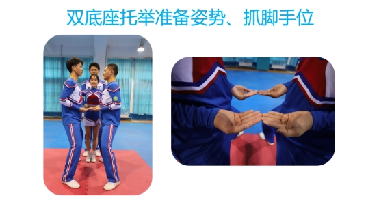 1.双底座肩位托举的同步发力,手位高度的统一。 2.安全保护意识的培养。 |