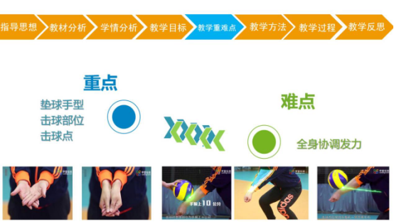 根据教学目标及学生排球技术水平情况,确定本课的重难点为: