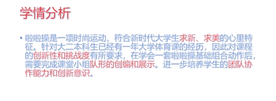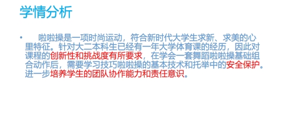 啦啦操是一项时尚运动,符合新时代大学生求新、求美的心里特征。针对大二本科生已经有一年大学体育课的经历,因此对课程的创新性和挑战度有所要求,在学会一套舞蹈啦啦操基础组合动作后,需要学习技巧啦啦操的基本技术和托举中的安全保护。进一步培养学生的团队协作能力和责任意识。 |