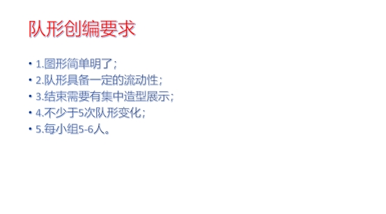 对队形配合中体现的团队协作给与肯定,体会完胜成套展示后的获得感和快乐。 |