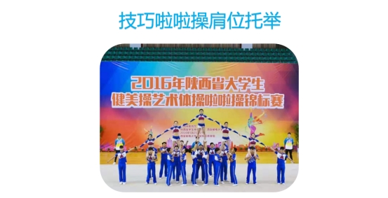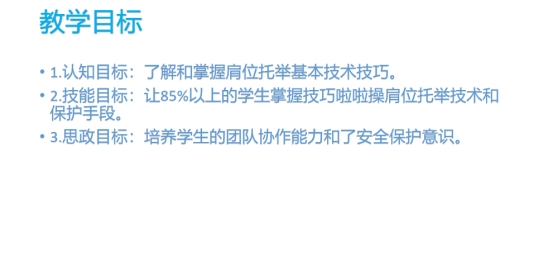 1.认知目标:了解和掌握肩位托举基本技术技巧。 2.技能目标:让85%以上的学生掌握技巧啦啦操肩位托举技术和保护手段。 3.思政目标:培养学生的团队协作能力和了安全保护意识。 |
