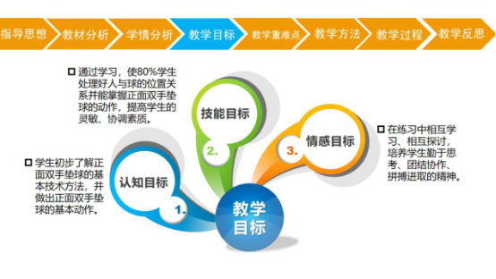 2、技能目标:85%的学生基本掌握气排球特有的各种垫球技术,20%的学生熟练掌握气排球特有的各种垫球技术,同时发展手部灵活性、反应灵敏性、上下肢协调性等身体素质。