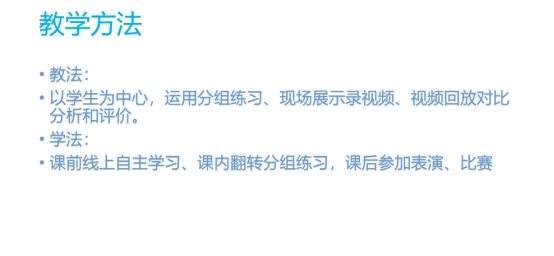 课前线上自主学习、课内翻转分组练习,课后参加表演、比赛 |