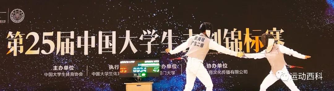 第二十五届全国大学生击剑锦标赛于2019112226日在厦门大学举行。共有来自北京、广东、上海、陕西等52所高校近600名运动员参赛。本次赛事由中国大学生体育协会主办、中国大学生体育协会击剑分会执行,由厦门大学承办,无锡威腾体育文化传播有限公司协办。